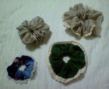 左下は、妹と共通のシュシュ。それぞれ1本ずつ作りました。最初に作ったもの。蝶々があしらわれた落ち着いた柄です。白いレースをつけてみました。これはプレゼントの予定。