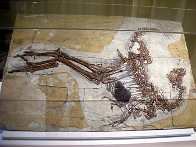 見づらいかも知れませんが、骨の周囲を取り巻くものが羽毛です。復元図のしっぽの先っちょがとても華麗でした。肋骨の下に見えるのは胃石。