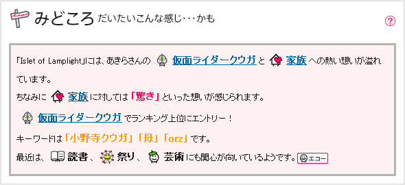 これのみどころ紹介って、記事を書くたびに変わるんですが、そのたびになんでそんなとこ着目するの、と突っこみたくなるような解説をしてくれたりします。毎回チェックしているけど、なんだか……ある意味すごい。ひとつかふたつしか入れていない言葉がキーワードになってたりとか、連呼していることに少しもかすらなかったりとか。