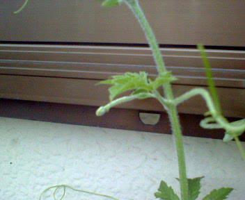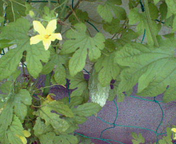左上に咲いているのは雄花です。真ん中のが、今現在、唯一実っているニガウリ。